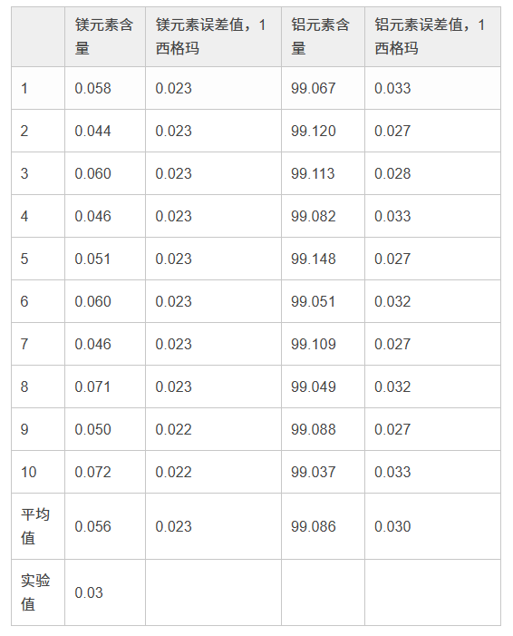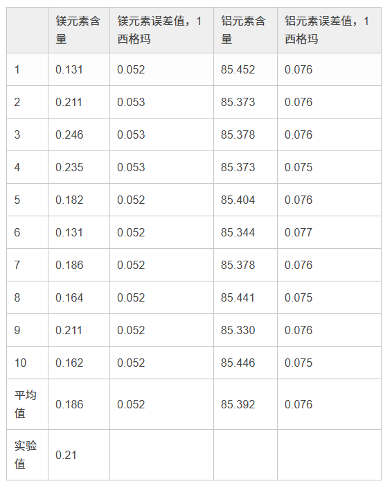 在檢測牌號為1100的鋁合金時,使用40 kV光束進行3秒鐘檢測,以及使用13 kV光束進行60秒鐘檢測,所得到的結(jié)果。