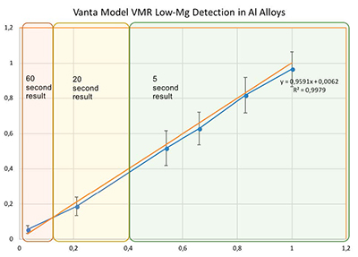 大多數(shù)鋁合金牌號中的鎂元素含量都等于或大于0.4%。因此,使用低能量光束進行檢測,只需5秒鐘時間,就可以根據(jù)所測到的鎂元素含量水平,準確地對大多數(shù)鋁合金進行分揀(總共需要6秒鐘)。這些結(jié)果表明只需進行相對較短時間的檢測,就可以準確地辨別含有少量鎂元素的不同牌號的鋁合金。
