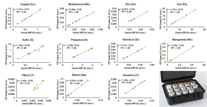 以下數(shù)據(jù)表明了Vanta手持式光譜分析儀在分析一系列由OREAS(礦石研究和勘探分析標(biāo)準(zhǔn)公司)提供的斑巖銅認(rèn)證參考樣品(CRM)和IOCG(氧化鐵銅金)pXRF商用試劑盒樣品時表現(xiàn)出的開箱即用性。CRM數(shù)據(jù)與Vanta手持式光譜分析儀所獲得的數(shù)據(jù)高度吻合,表明Vanta手持式XRF分析儀在分析采自這些礦床類型的完全制備好的樣品時可提供高質(zhì)量的數(shù)據(jù)。