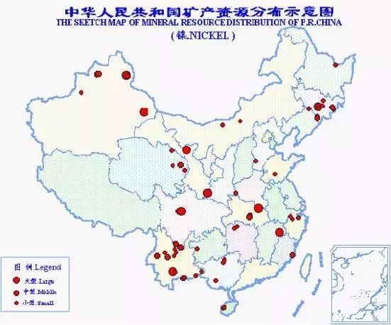 中國(guó)鎳礦資源不能滿足需要??偙S袃?chǔ)量鎳784萬噸,居世界第9位。鎳礦產(chǎn)地有近100處,分布于18個(gè)?。▍^(qū))。