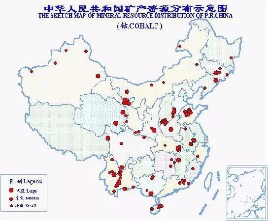 中國(guó)鈷礦資源不多,獨(dú)立鈷礦床尤少,主要作為伴生礦產(chǎn)與鐵、鎳、銅等其他礦產(chǎn)一道產(chǎn)出。已知鈷礦產(chǎn)地150處,分布于24個(gè)省(區(qū)),以甘肅省儲(chǔ)量最多,約占全國(guó)總儲(chǔ)量的30%。全國(guó)總保有儲(chǔ)量鈷47萬噸。