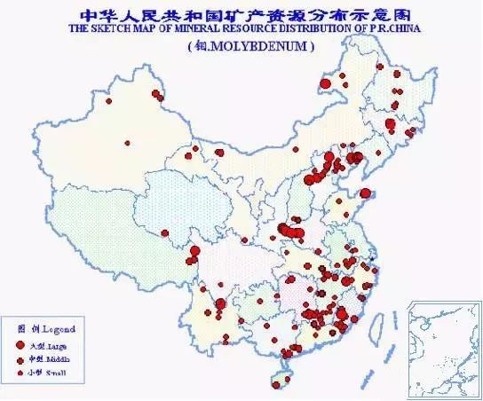 中國(guó)鉬礦資源豐富,總保有儲(chǔ)量鉬840萬噸,居世界第2位。探明儲(chǔ)量的礦區(qū)有222處,分布于28個(gè)?。▍^(qū)、市)。以河南省鉬礦資源為最豐富,鉬儲(chǔ)量占全國(guó)總儲(chǔ)量的30.1%。