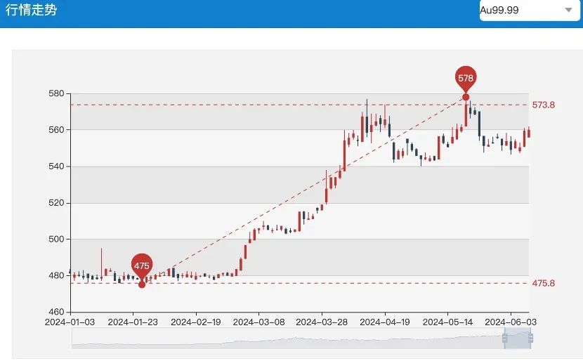 拉長時間看,盡管近期現(xiàn)貨黃金價格有所回落,但年初至6月7日漲幅仍超11%。國內(nèi)金價亦不斷攀升,上海黃金交易所AU9999年內(nèi)最高觸及578元/克,較年初低點475元/克漲幅達(dá)21.68%。