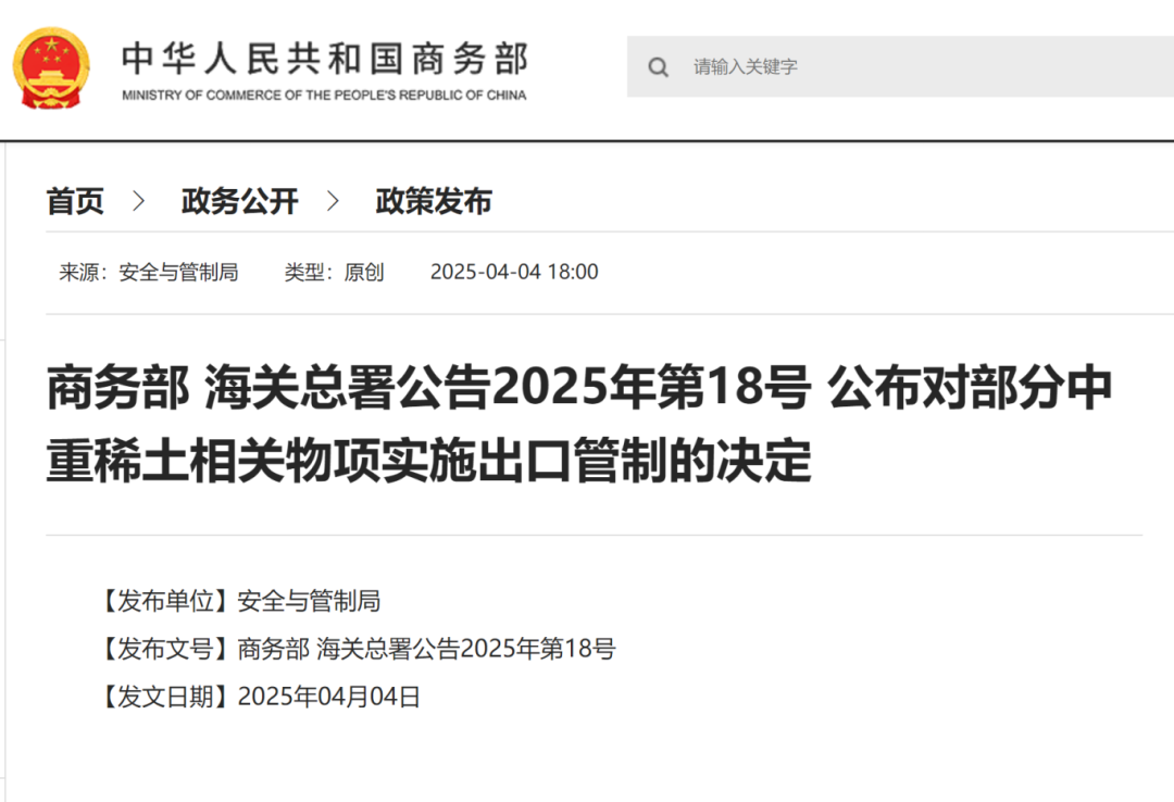 根據《中華人民共和國出口管制法》等有關法律法規(guī),4月4日,商務部會同海關總署發(fā)布關于對釤、釓、鋱、鏑、镥、鈧、釔等7類中重稀土相關物項實施出口管制措施的公告,并于發(fā)布之日起正式實施。