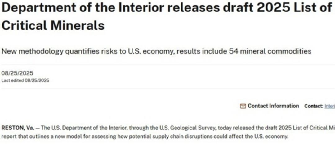 當?shù)貢r間8月25日,美國地質(zhì)調(diào)查局發(fā)布《2025年關(guān)鍵礦產(chǎn)清單》草案,54種礦產(chǎn)被列入清單。根據(jù)美國《能源法案》,關(guān)鍵礦產(chǎn)是由美國地質(zhì)勘探局認定的對美國經(jīng)濟和國家安全至關(guān)重要的礦產(chǎn)或物質(zhì),且相關(guān)礦產(chǎn)是產(chǎn)品制造的基礎(chǔ),但供應鏈脆弱。被確定為關(guān)鍵礦產(chǎn)后,相關(guān)礦產(chǎn)的勘探開采和處理將享受資金激勵和更廣泛的支持性政策。